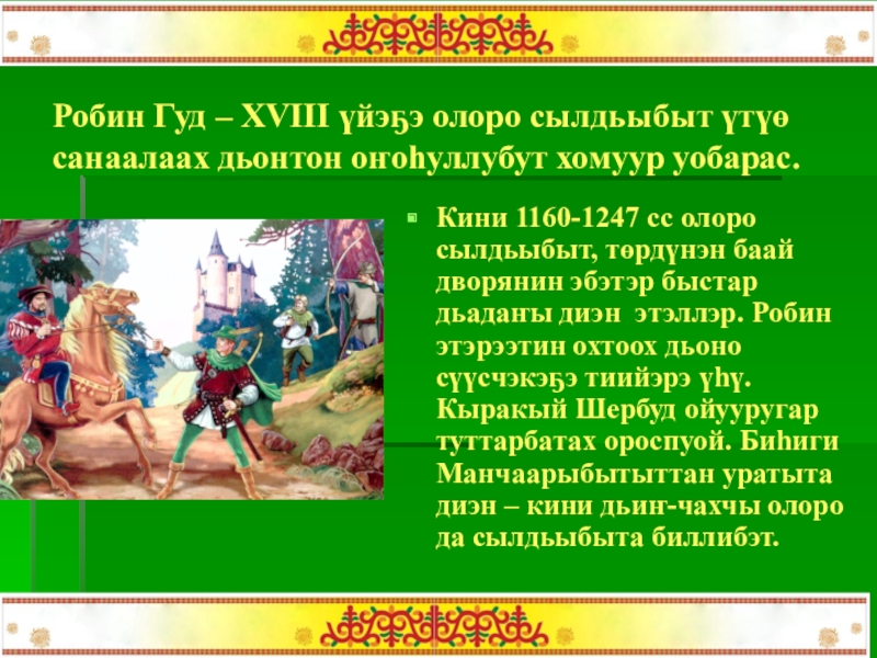 Слайд 9Робин Гуд – ХVIII үйэҕэ олоро сылдьыбыт үтүө санаалаах дьонтон оҥоһуллубут