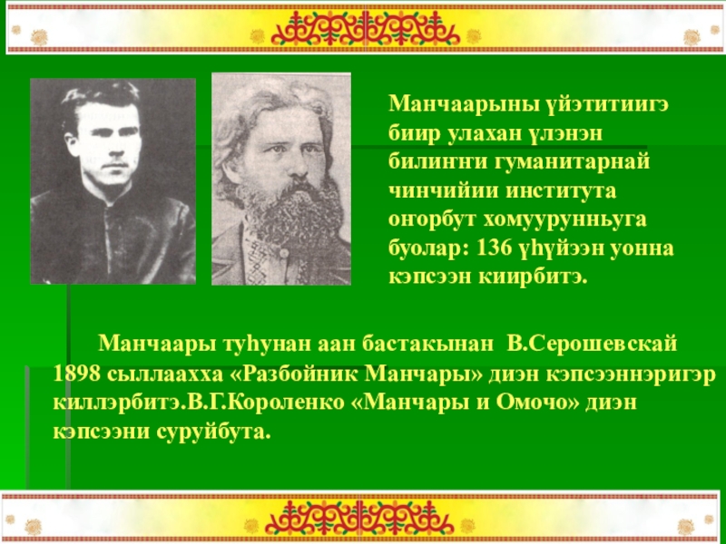 Слайд 26 Манчаары туһунан аан бастакынан В.Серошевскай 1898 сыллаахха «Разбойник Манчары» диэн кэпсээннэригэр