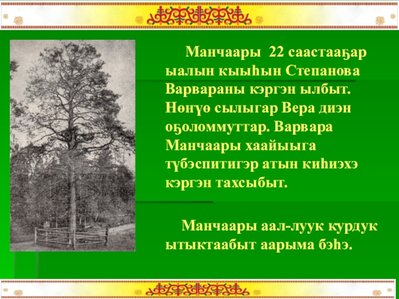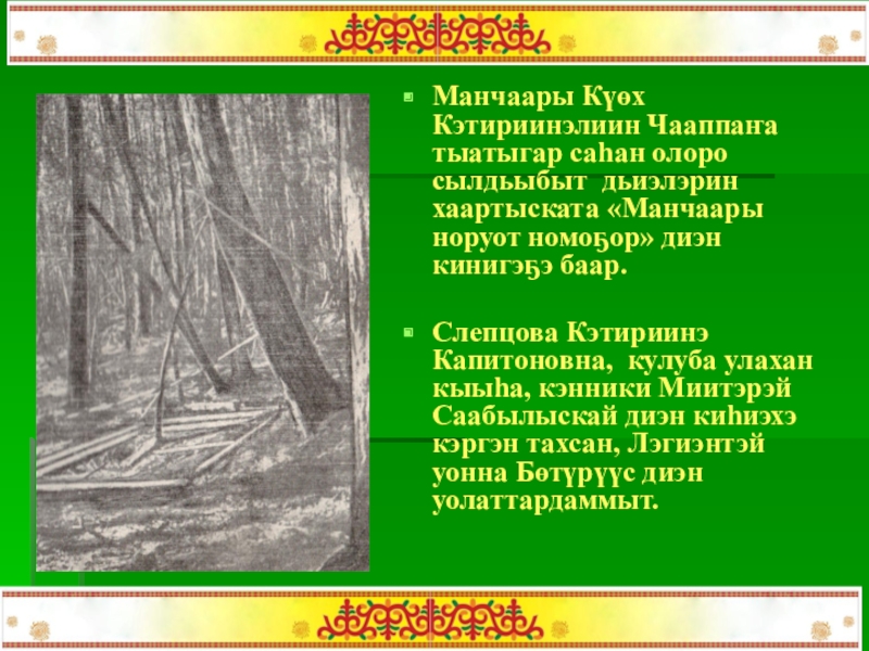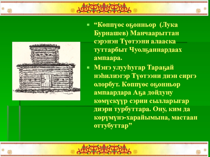 Слайд 14“Көппүөс оҕонньор (Лука Бурнашев) Манчаарыттан сэрэнэн Түөтээни алааска туттарбыт Чуолҕаннардаах ампаара.