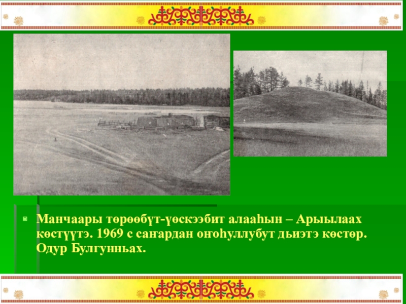 Слайд 5Манчаары төрөөбүт-үөскээбит алааһын – Арыылаах көстүүтэ. 1969 с саҥардан оҥоһуллубут дьиэтэ