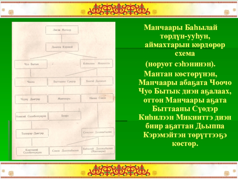 Манчаары Баһылай төрдүн-ууһун, аймахтарын көрдөрөр схема