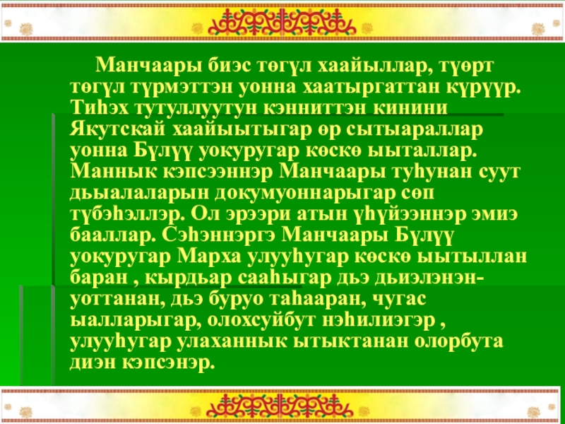 Слайд 6 «Манчаары тас көрүҥэ: уһун соҕус сомоҕо эттээх сирэйдээх, арыы-саһыл хааннаах, эрэһэлээбит