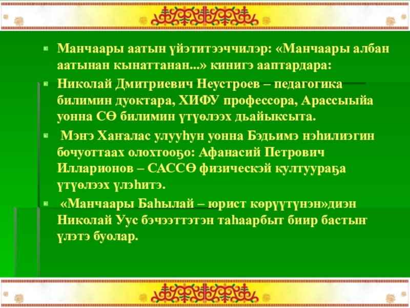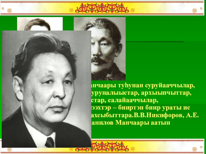 Слайд 24Саха литературатыгар Манчаары туһунан суруйааччылар, билим-үөрэх үлэһиттэрэ, суруналыыстар, архыыпчыттар, культура үлэһиттэрэ,