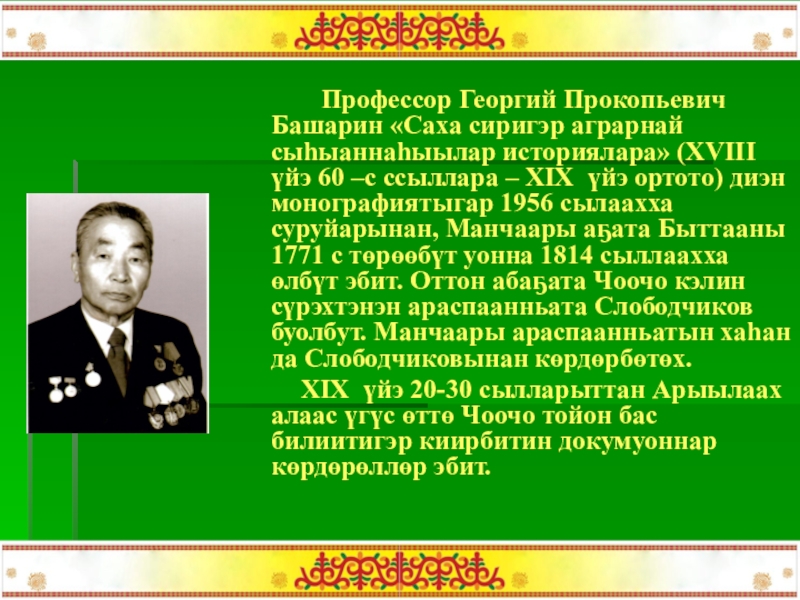 Слайд 7 Профессор Георгий Прокопьевич Башарин «Саха сиригэр аграрнай сыһыаннаһыылар историялара» (ХVIII үйэ