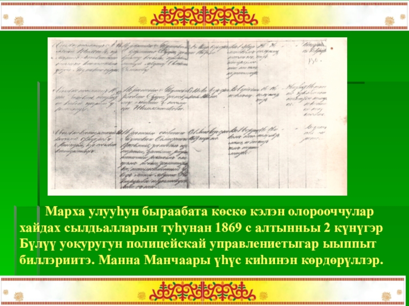 Слайд 20 Марха улууһун быраабата көскө кэлэн олорооччулар хайдах сылдьалларын туһунан 1869 с