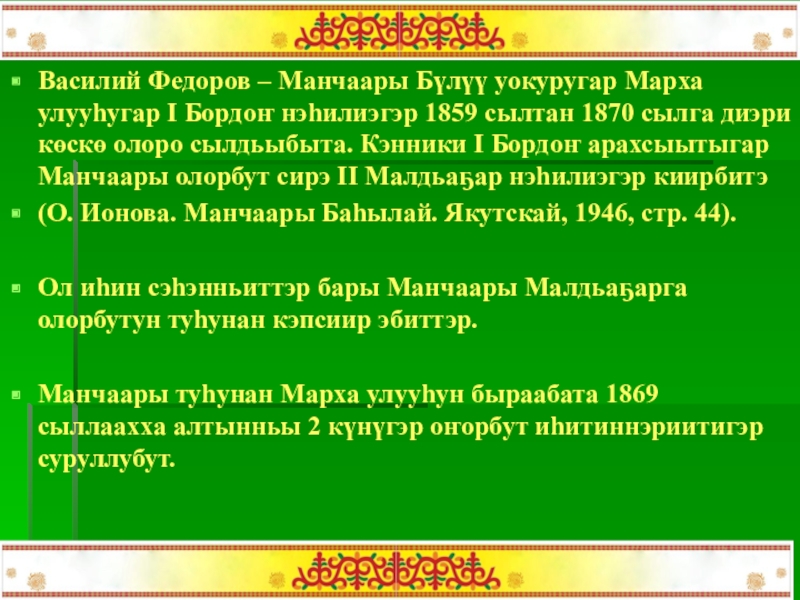 (О. Ионова. Манчаары Баһылай. Якутскай, 1946, стр. 44).
