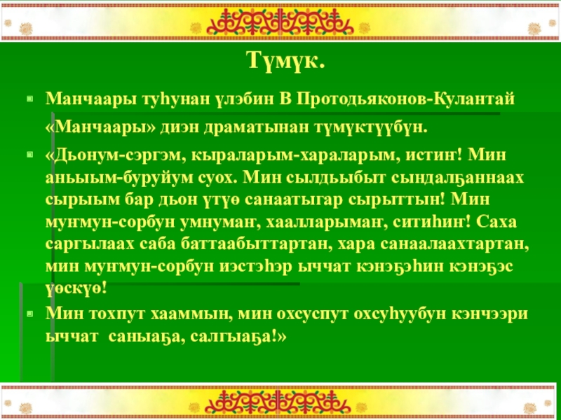 Манчаары туһунан үлэбин В Протодьяконов-Кулантай «Манчаары» диэн драматынан түмүктүүбүн.