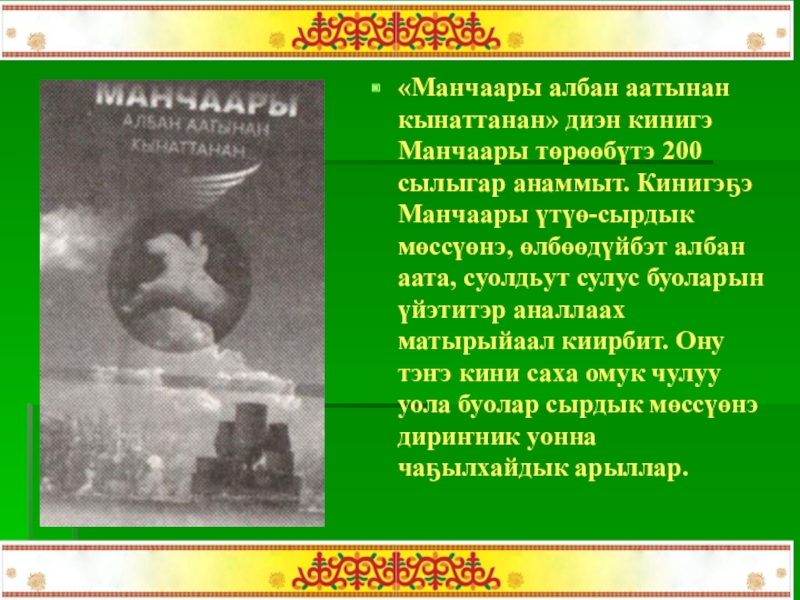 Слайд 27«Манчаары албан аатынан кынаттанан» диэн кинигэ Манчаары төрөөбүтэ 200 сылыгар анаммыт.