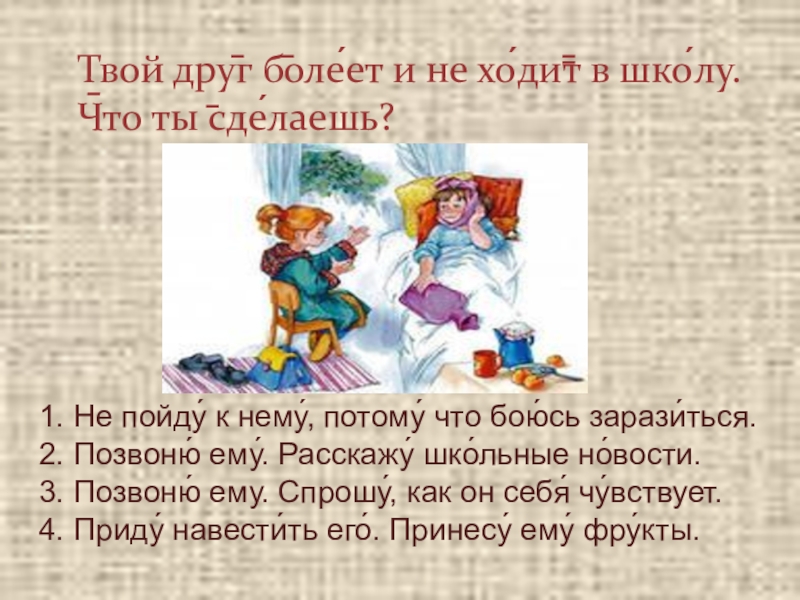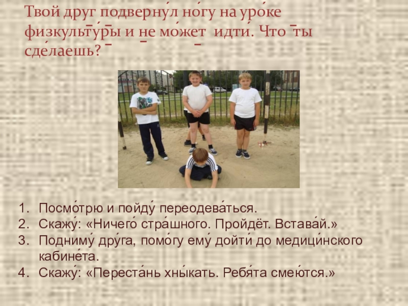 Подниму́ дру́га, помо́гу ему́ дойти́ до медици́нского кабине́та.
