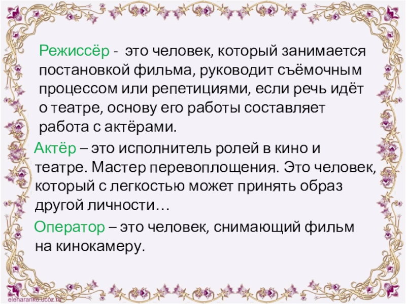 Оператор – это человек, снимающий фильм на кинокамеру.