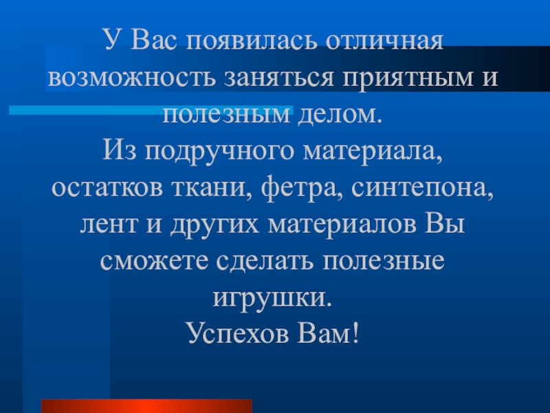 материала, остатков ткани, фетра, синтепона, лент и других материалов Вы сможете сделать полезные игрушки. Успехов Вам!