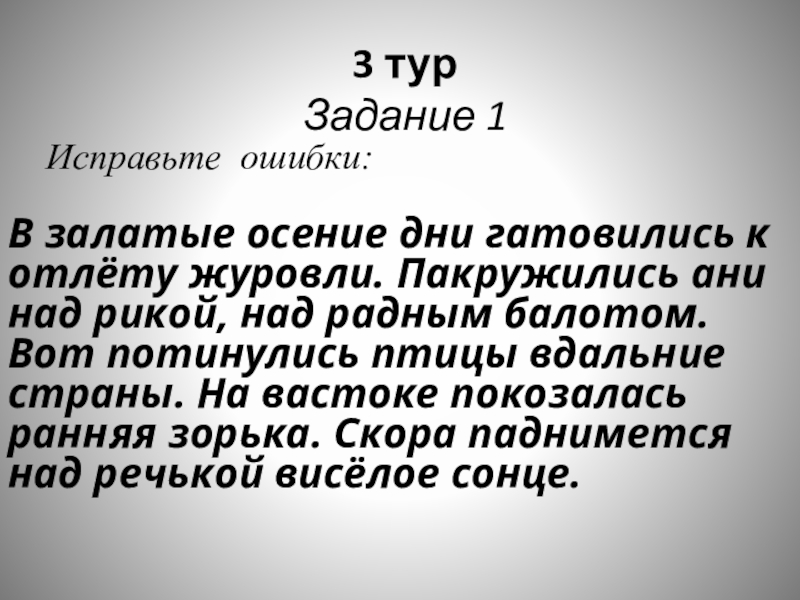 к отлёту журовли. Пакружились ани над рикой, над радным балотом. Вот потинулись птицы вдальние страны. На вастоке покозалась ранняя зорька. Скора паднимется над речькой висёлое сонце.
