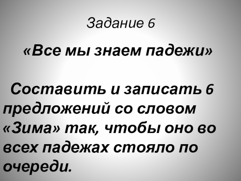 и записать 6 предложений со словом «Зима» так, чтобы оно во всех падежах стояло по очереди.