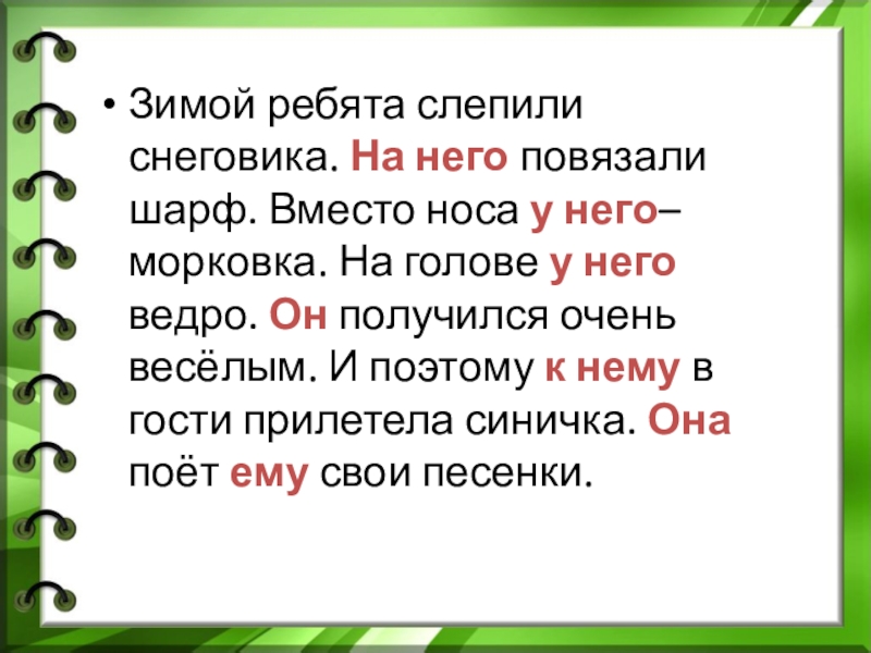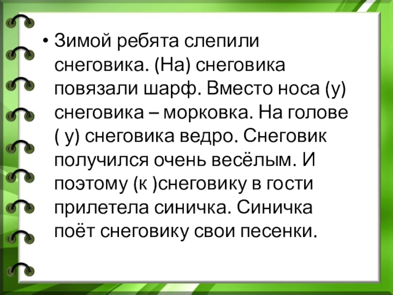 Слайд 20Зимой ребята слепили снеговика. (На) снеговика повязали шарф. Вместо носа (у)