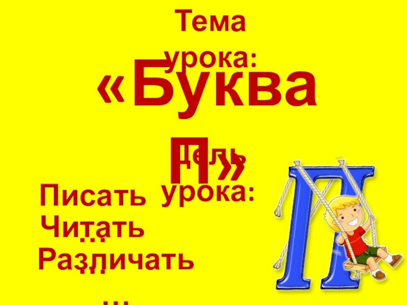 Тема урока:«Буква П»Цель урока:Писать…Читать…Различать…