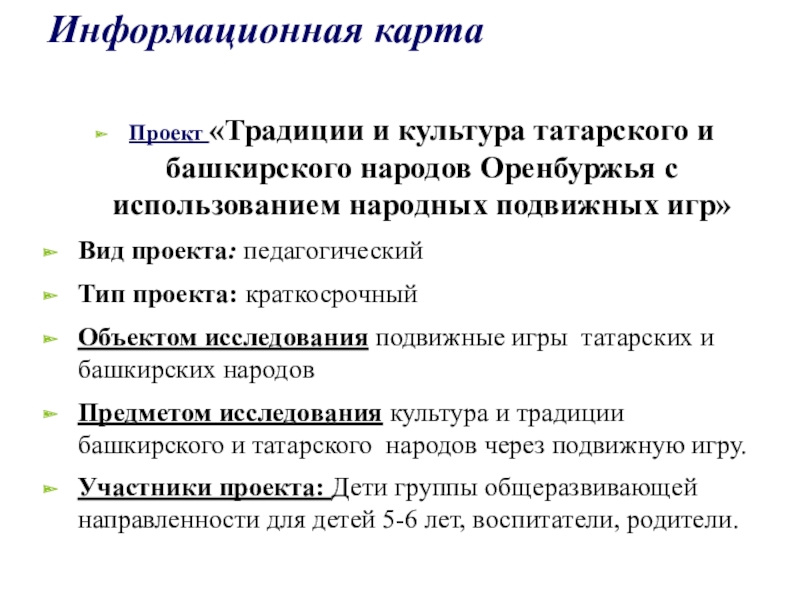 Цель проекта: Создание условий для формирования у детей элементарных представлений о культуре и традициях башкирского и татарского народов через подвижную игру.