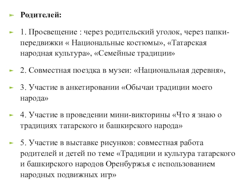 2. Консультация для родителей; оформление родительского уголка по теме: «Традиции и культура татарского и башкирского народов Оренбуржья с использованием народных подвижных игр»