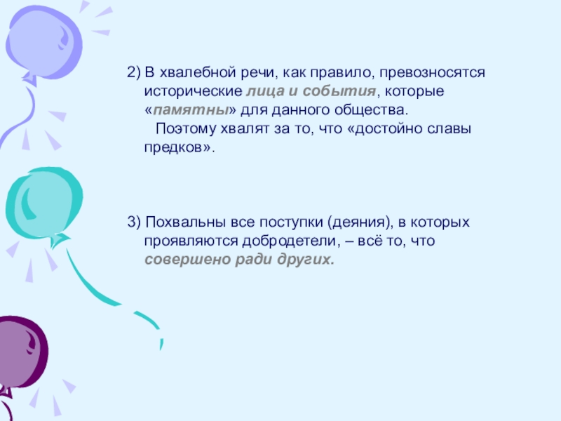 2) В хвалебной речи, как правило, превозносятся  исторические лица и события, которые  «памятны» для данного