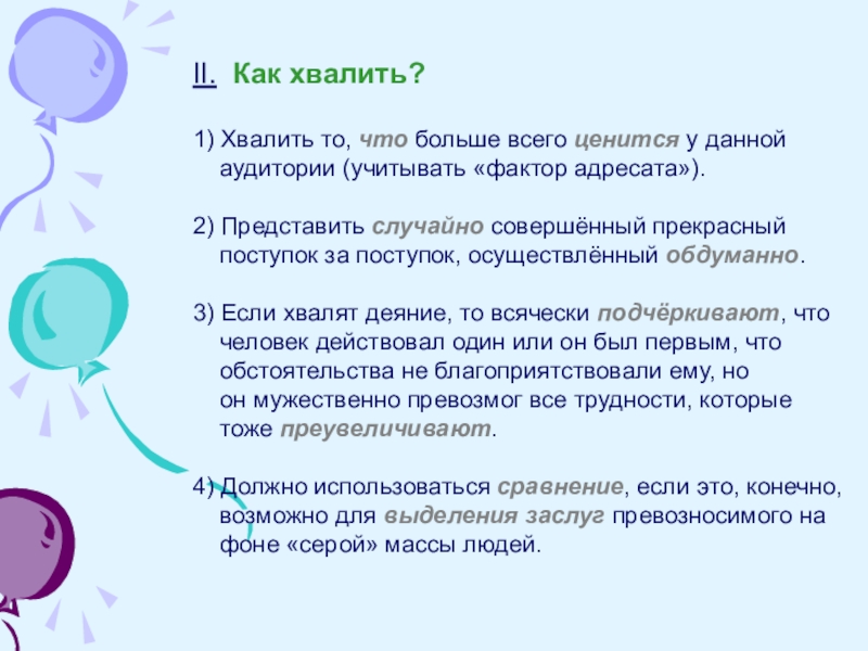 II. Как хвалить?1) Хвалить то, что больше всего ценится у данной  аудитории (учитывать «фактор адресата»).2) Представить