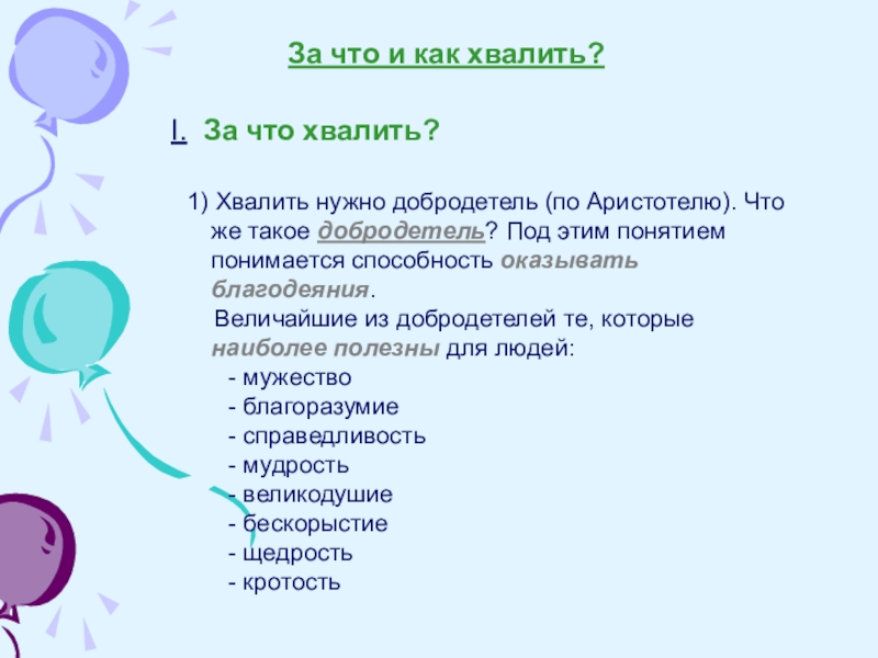 За что и как хвалить?I. За что хвалить? 1) Хвалить нужно добродетель (по Аристотелю). Что