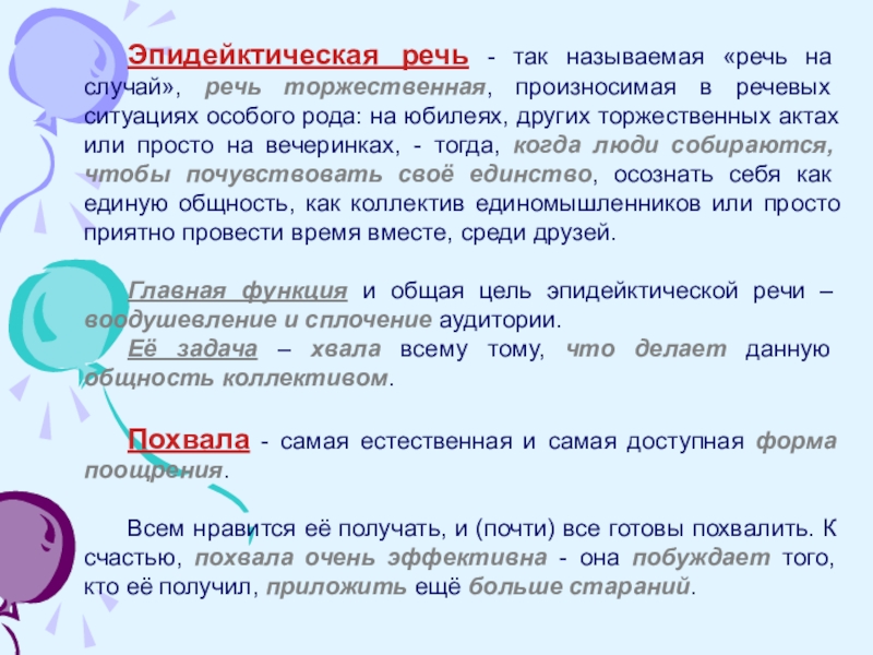 Эпидейктическая речь - так называемая «речь на случай», речь торжественная, произносимая в речевых ситуациях особого рода: на