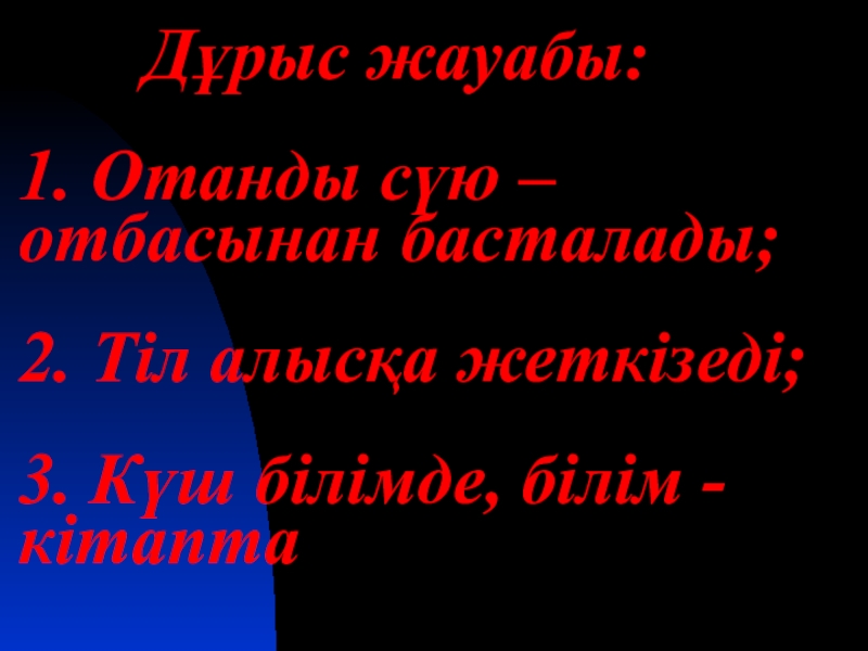 Слайд 43 Дұрыс жауабы: 1. Отанды сүю – отбасынан