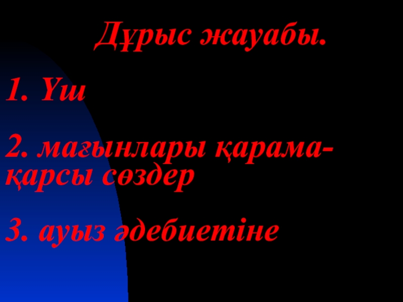 Слайд 10 Дұрыс жауабы. 1. Үш 2. мағынлары қарама-қарсы