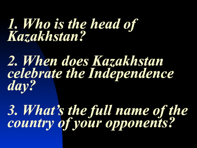 Слайд 111. Who is the head of Kazakhstan? 2. When does Kazakhstan celebrate
