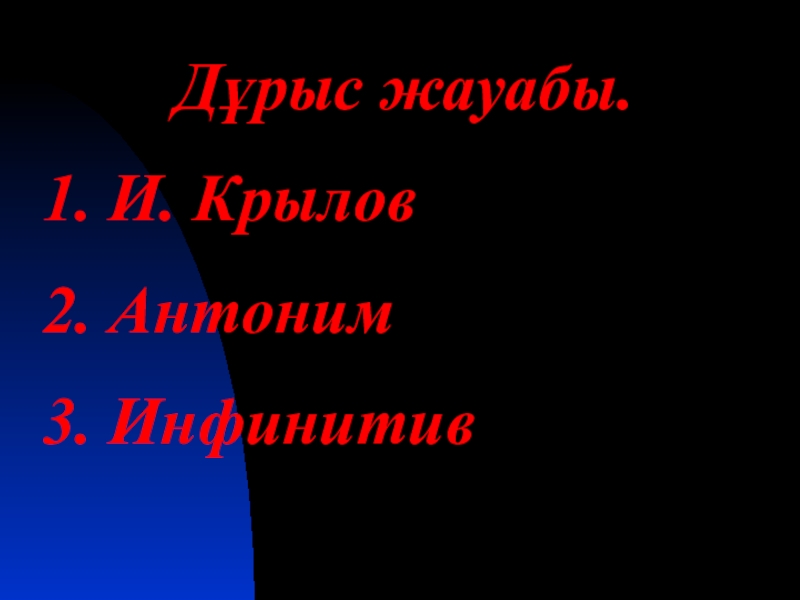 Слайд 14 Дұрыс жауабы. 1. И. Крылов 2. Антоним 3. Инфинитив