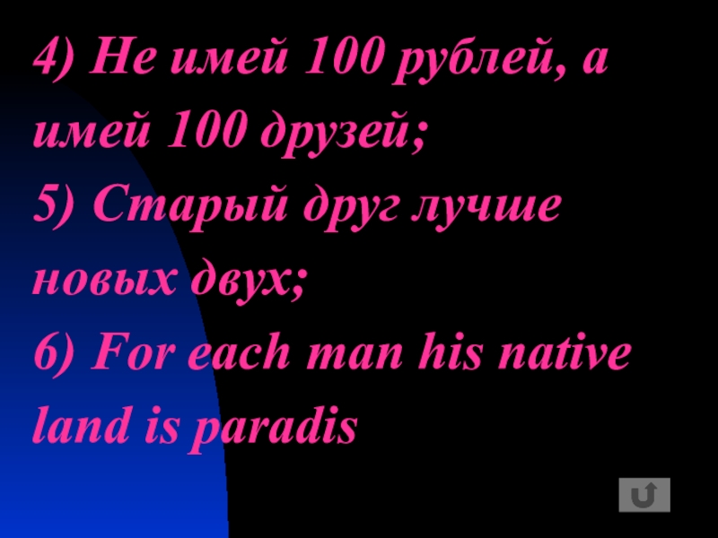 4) Не имей 100 рублей, а имей 100 друзей; 5) Старый друг лучше новых двух; 6) For