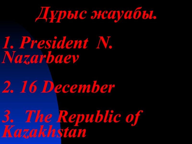 Слайд 12 Дұрыс жауабы. 1. President N. Nazarbaev 2. 16