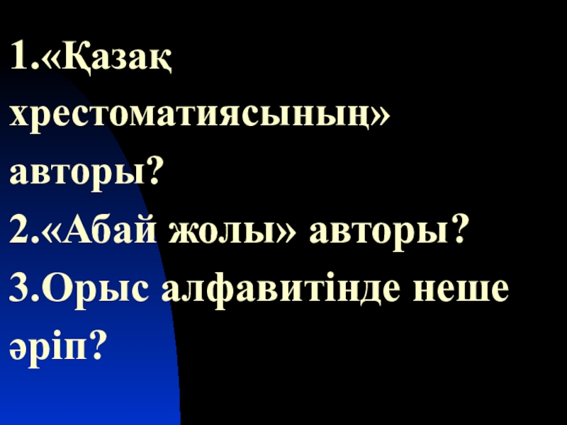 1.«Қазақ     хрестоматиясының» авторы?        2.«Абай жолы» авторы? 3.Орыс алфавитінде неше әріп?