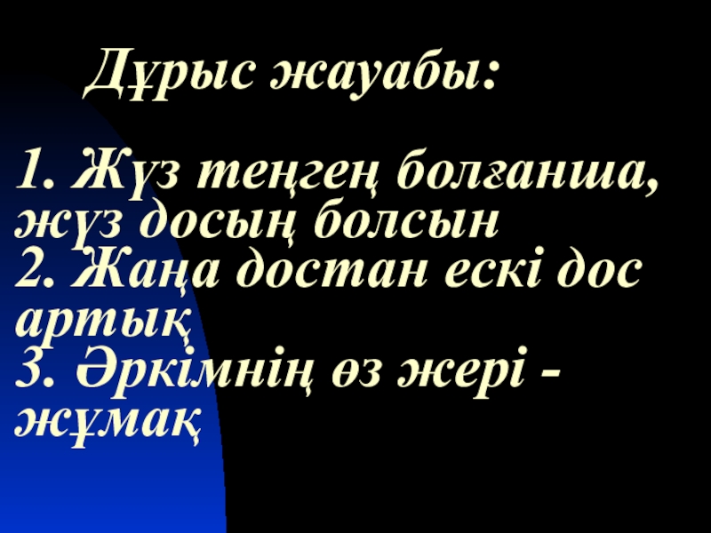 Слайд 45 Дұрыс жауабы: 1. Жүз теңгең болғанша, жүз досың