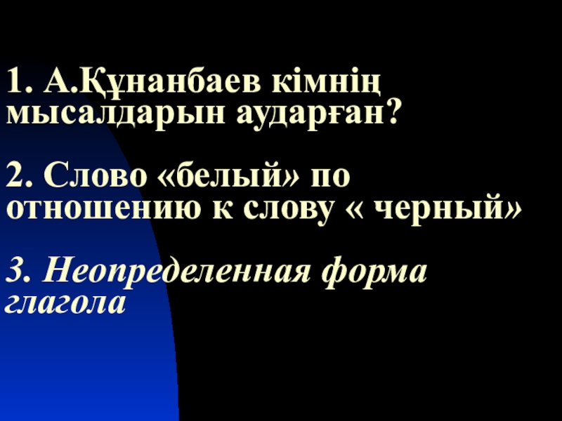 1. А.Құнанбаев кімнің мысалдарын аударған?   2. Слово «белый» по отношению к слову « черный»  3.