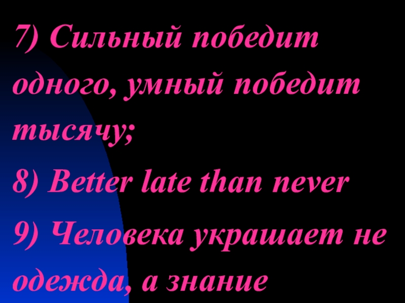 7) Сильный победит одного, умный победит тысячу;8) Better late than never9) Человека украшает не одежда, а знание