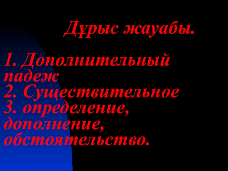 Слайд 8 Дұрыс жауабы. 1. Дополнительный падеж 2.