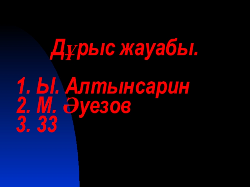 Дұрыс жауабы.  1. Ы. Алтынсарин  2. М. Әуезов  3. 33