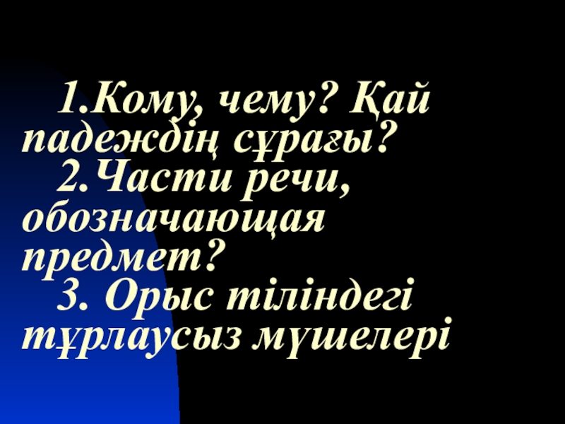 1.Кому, чему? Қай падеждің сұрағы?     2.Части речи, обозначающая предмет?    3.