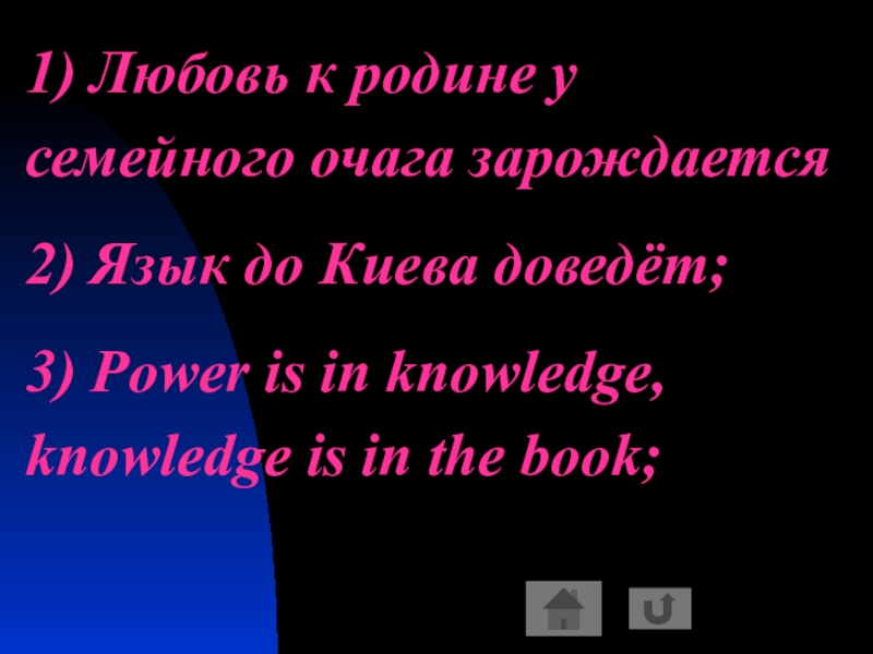 1) Любовь к родине у семейного очага зарождается2) Язык до Киева доведёт;3) Power is in knowledge, knowledge