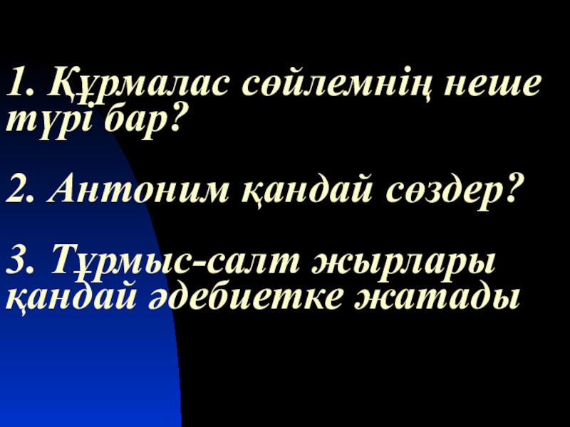 1. Құрмалас сөйлемнің неше түрі бар?  2. Антоним қандай сөздер?  3. Тұрмыс-салт жырлары қандай әдебиетке