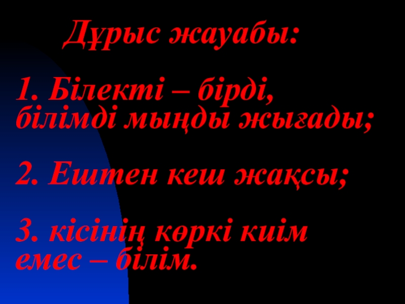 Слайд 47 Дұрыс жауабы: 1. Білекті – бірді, білімді мыңды жығады; 2.