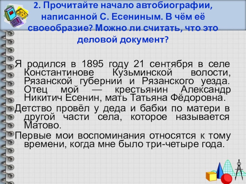 Я родился в 1895 году 21 сентября в селе Константинове Кузьминской волости, Рязанской губернии и Рязанского уезда. Отец мой — крестьянин Александр Никитич Есенин, мать Татьяна Фёдоровна.