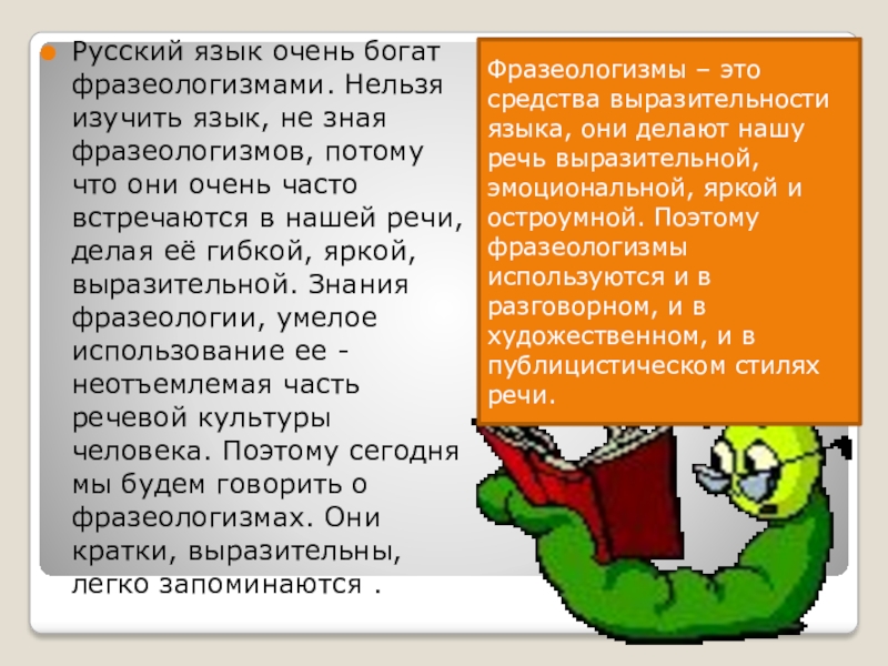 Фразеологизмы – это средства выразительности языка, они делают нашу речь выразительной, эмоциональной, яркой и остроумной. Поэтому фразеологизмы используются и в разговорном, и в художественном, и в публицистическом стилях речи.