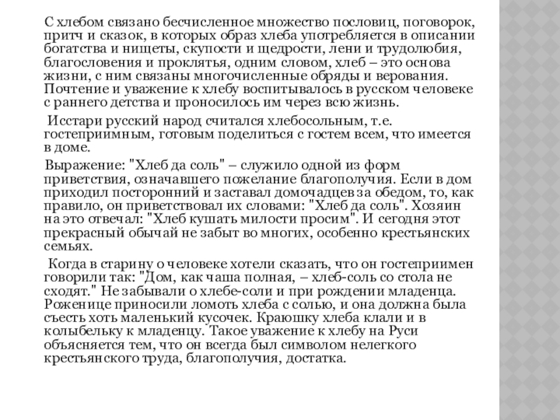 родит хлеб, а небо» и называли хлеб «небесный», «божественный». Самым большим грехом на Руси считалось уронить хотя бы одну крошку хлеба, еще большим – растоптать эту крошку ногами. Не из-за скупости подбираются все крошки за столом, а из-за почтительного отношения к бесценному продукту. Хлебом солью всегда встречали гостей дорогих, заезжего гостя. Этим они доказывали свою почтенную покорность.
