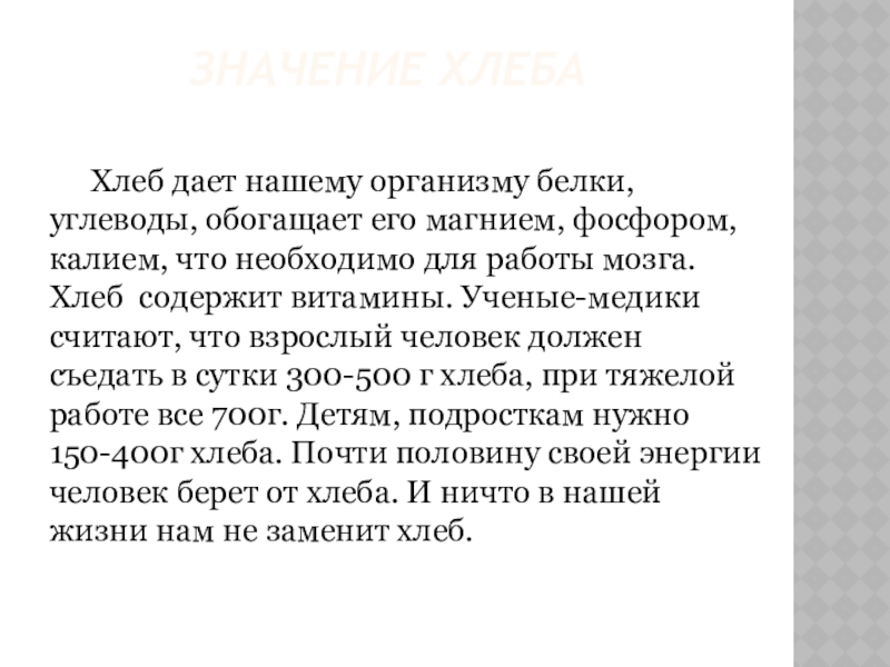 белки, углеводы, обогащает его магнием, фосфором, калием, что необходимо для работы мозга. Хлеб содержит витамины. Ученые-медики считают, что взрослый человек должен съедать в сутки 300-500 г хлеба, при тяжелой работе все 700г. Детям, подросткам нужно 150-400г хлеба. Почти половину своей энергии человек берет от хлеба. И ничто в нашей жизни нам не заменит хлеб.