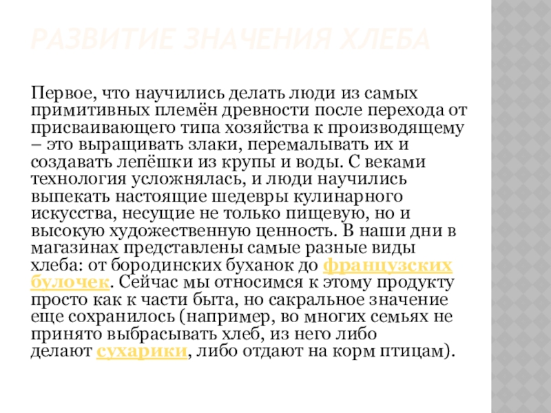 древности после перехода от присваивающего типа хозяйства к производящему – это выращивать злаки, перемалывать их и создавать лепёшки из крупы и воды. С веками технология усложнялась, и люди научились выпекать настоящие шедевры кулинарного искусства, несущие не только пищевую, но и высокую художественную ценность. В наши дни в магазинах представлены самые разные виды хлеба: от бородинских буханок до французских булочек. Сейчас мы относимся к этому продукту просто как к части быта, но сакральное значение еще сохранилось (например, во многих семьях не принято выбрасывать хлеб, из него либо делают сухарики, либо отдают на корм птицам).