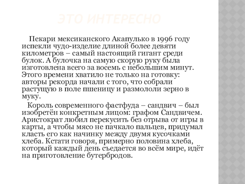 Король современного фастфуда – сандвич – был изобретён конкретным лицом: графом Сандвичем. Аристократ любил перекусить без отрыва от игры в карты, а чтобы мясо не пачкало пальцев, придумал класть его как начинку между двумя кусочками хлеба. Кстати говоря, примерно половина хлеба, который каждый день съедается во всём мире, идёт на приготовление бутербродов.