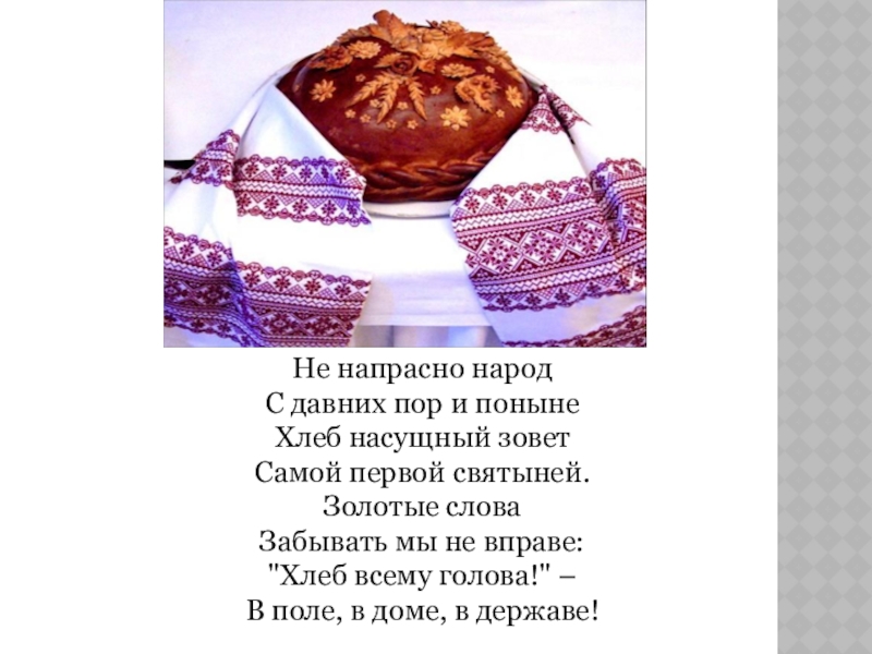 Слайд 8 Почитание хлеба началось давно. Древние земледельцы были убеждены, что «не пашня