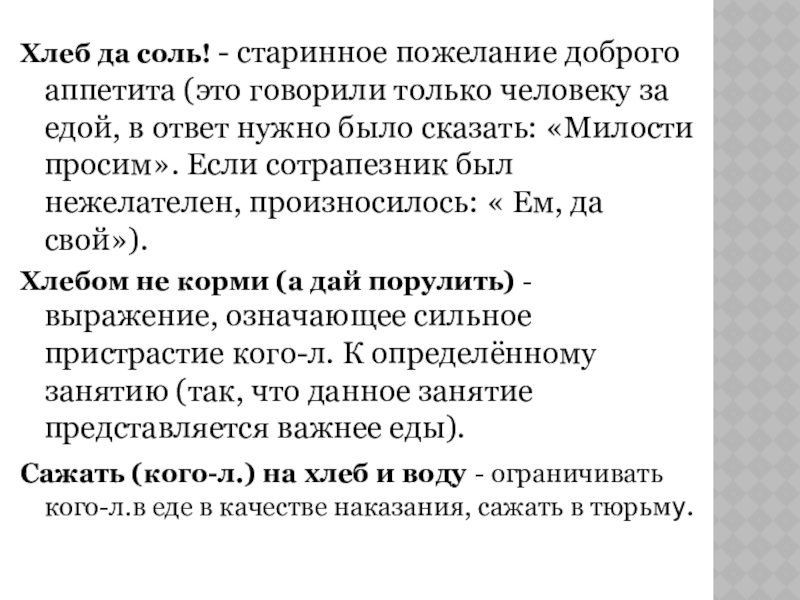 Выражение: "Хлеб да соль" – служило одной из форм приветствия, означавшего пожелание благополучия. Если в дом приходил посторонний и заставал домочадцев за обедом, то, как правило, он приветствовал их словами: "Хлеб да соль". Хозяин на это отвечал: "Хлеб кушать милости просим". И сегодня этот прекрасный обычай не забыт во многих, особенно крестьянских семьях.