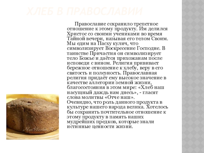 отношение к этому продукту. Им делился Христос со своими учениками во время Тайной вечери, называя его телом Своим. Мы едим на Пасху кулич, что символизирует Воскресение Господне. В таинстве Причастия он символизирует тело Божье и даётся прихожанам после исповеди с вином. Религия прививает бережное отношение к хлебу, веру в его святость и полезность. Православная религия придаёт ему высокое значение в качестве аллегории земной жизни, благосостояния в этом мире: «Хлеб наш насущный даждь нам днесь», - гласят слова молитвы «Отче наш».